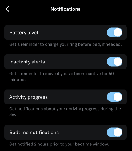 - From here, you have the ability to toggle on or off the five notifications sent from your Oura App. These include low battery level reminders, inactivity alerts, activity progress updates, and bedtime notifications