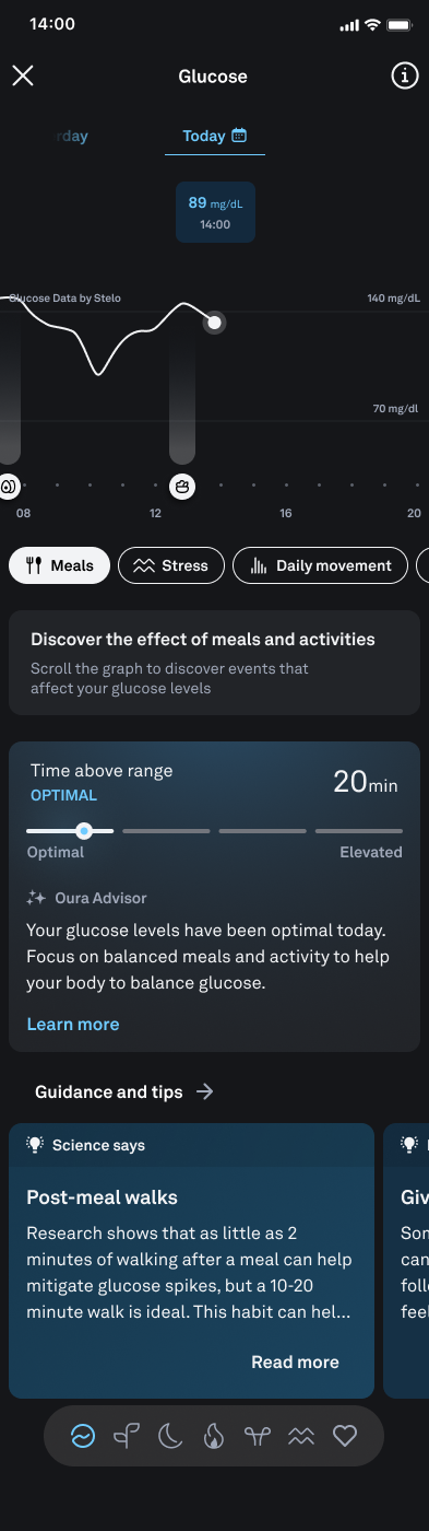 Once you've enabled the integration and started gathering data, you can find your glucose information in the Oura App: