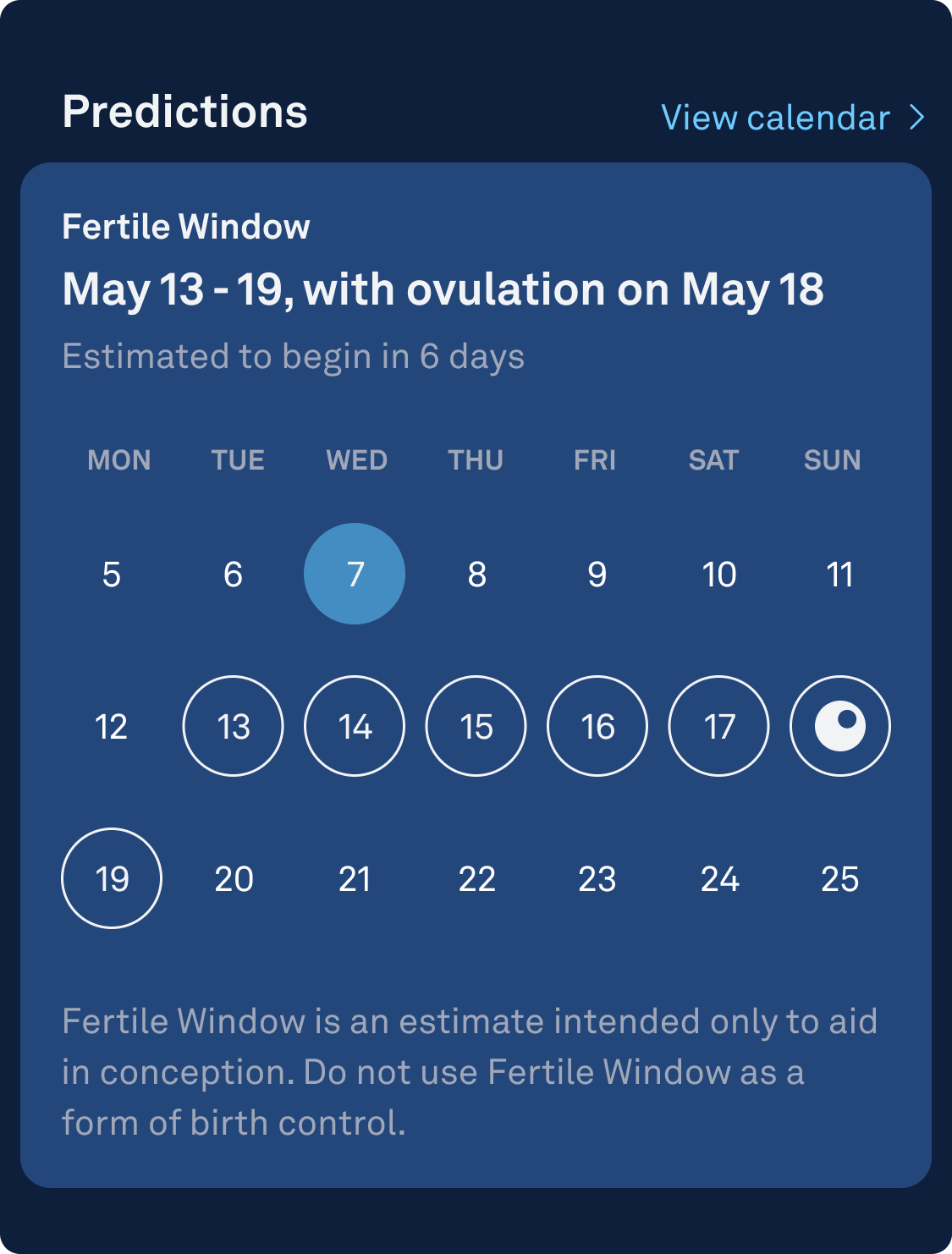 - The days within your estimated Fertile Window will be marked with white circles. Your estimated ovulation day will be marked with a solid white icon of an egg