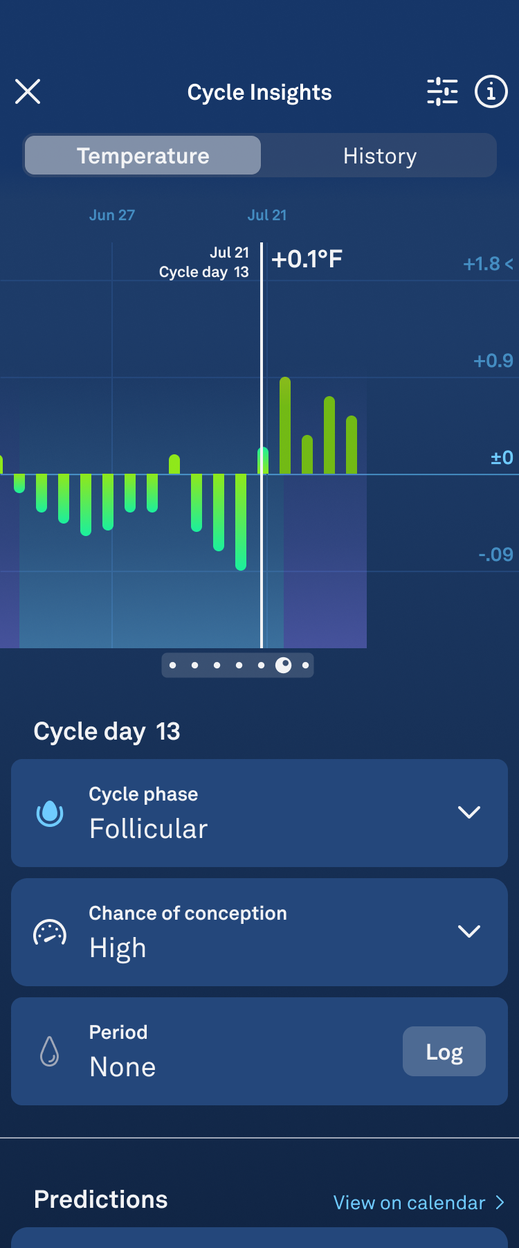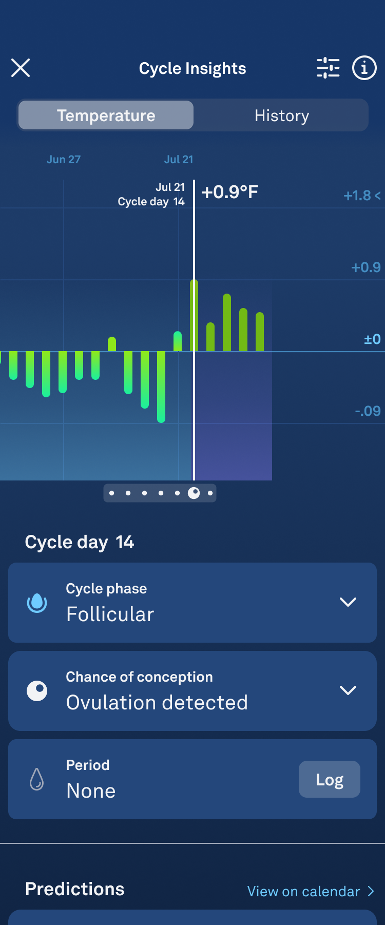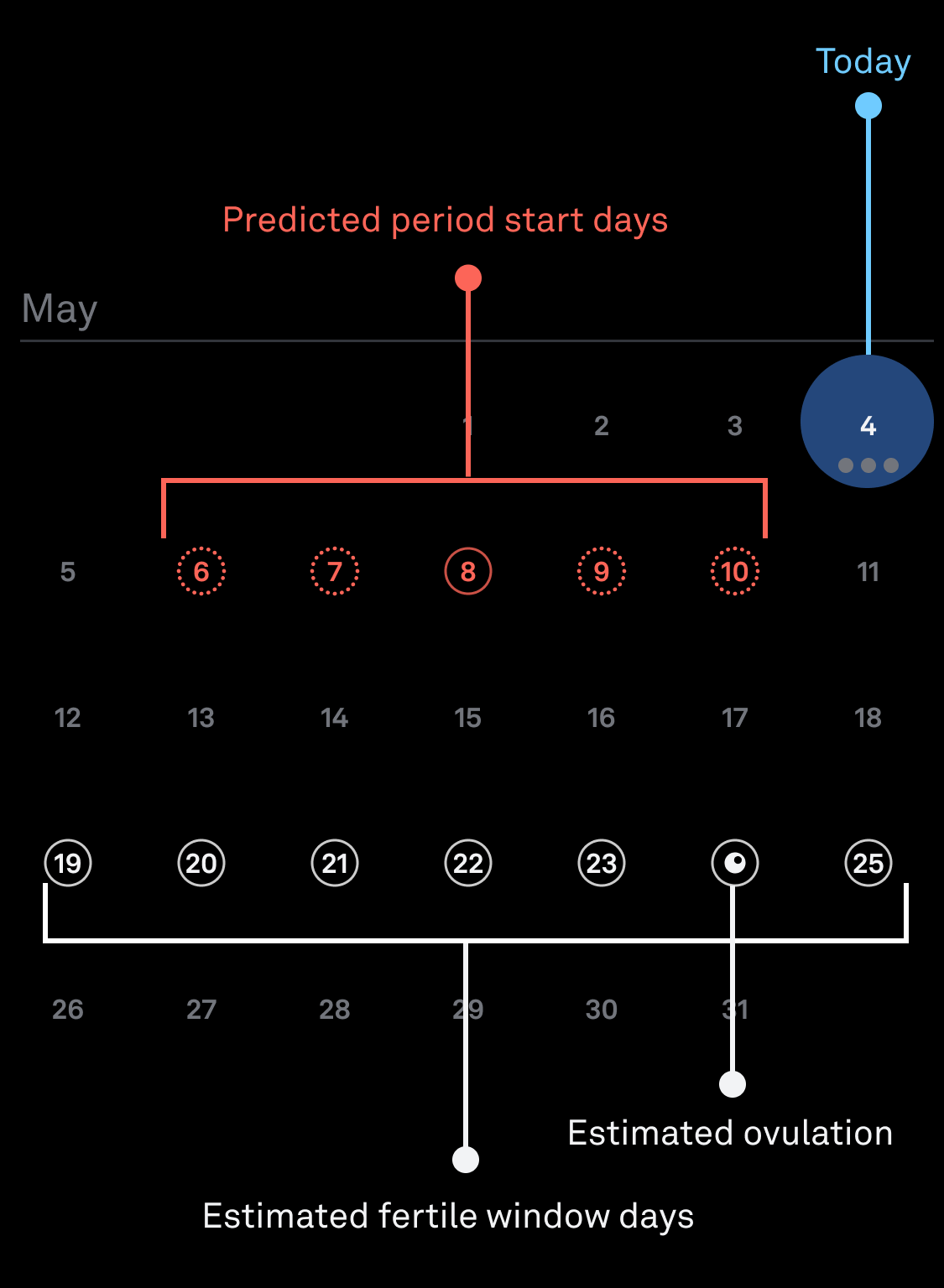 - Before ovulation is detected, in the Predictions section, you will notice certain days with dashed white circles, indicating your estimated Fertile Window