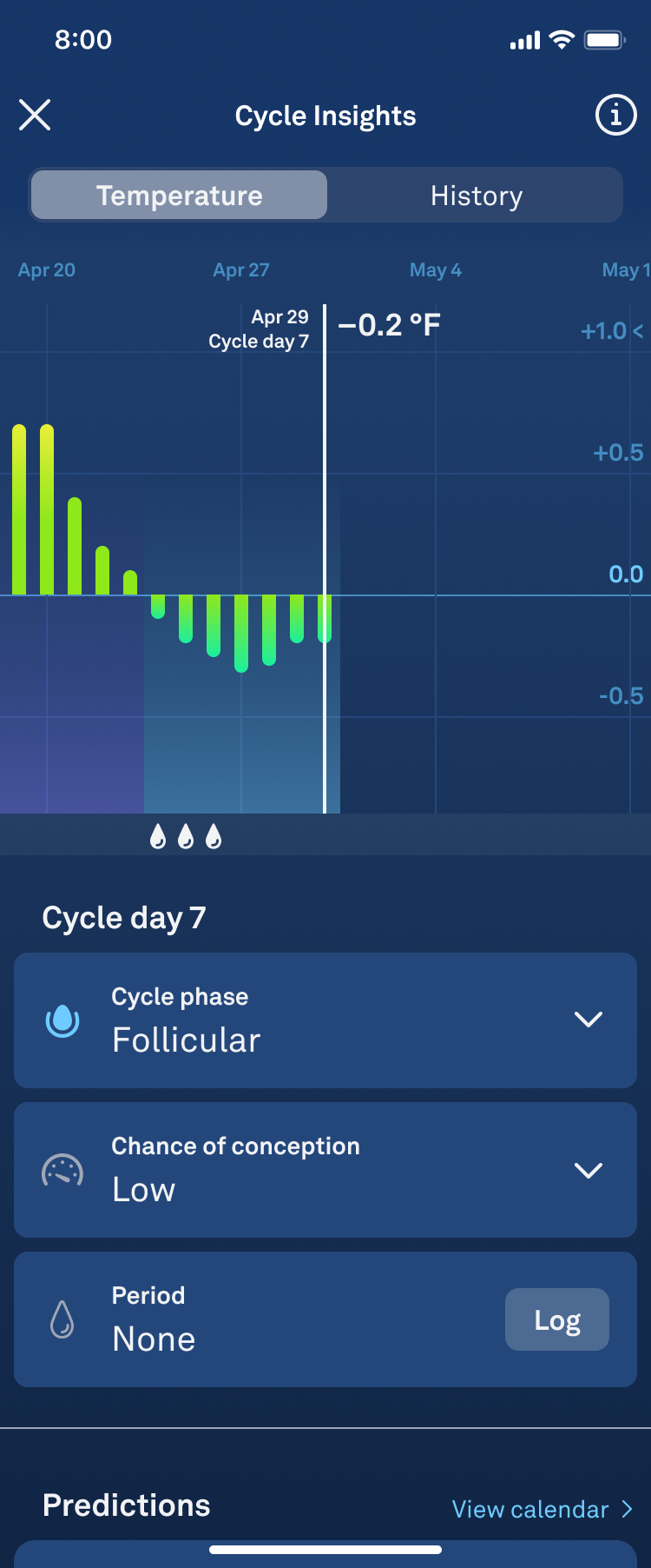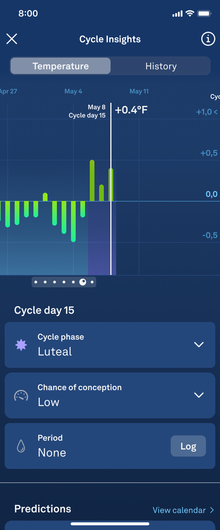 - The Predictions section will only show one predicted cycle event at a time—either your estimated Fertile Window or your next expected period