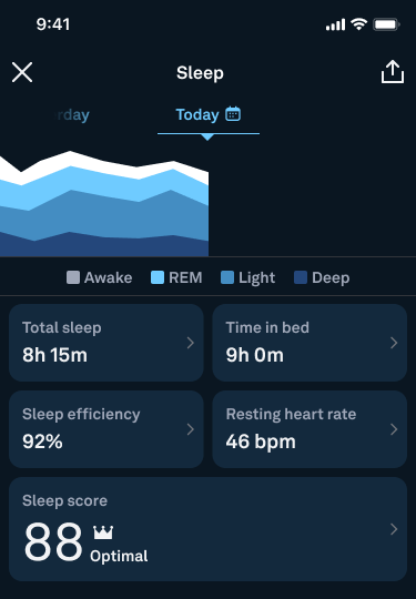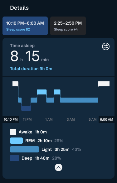 In the Sleep detail view, you'll find color-coded sleep stage data at the top of the screen. Your sleep stage hypnogram is also available under the Details section.