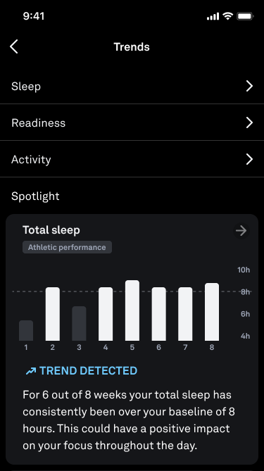 - At the top of the screen you'll find three featured trends, with a full list of Sleep, Readiness, Activity, and Stress metrics, as well as a Spotlight trend