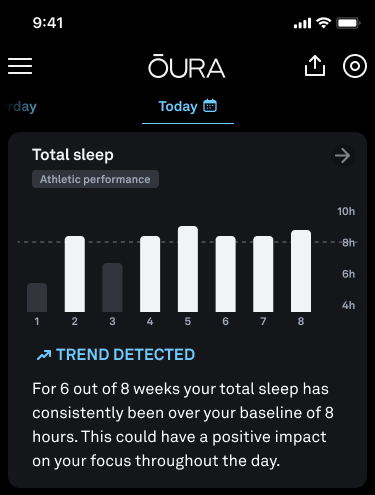 Use the Trends section of the Oura App to track changes in your sleep, readiness, activity, and stress metrics. Trends can be accessed through the upper-left menu on the Today tab of the Oura App.