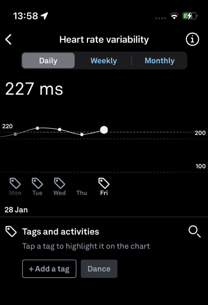 You can add and view tags directly from the trends screen within the Oura App. This will show correlations between behaviors or daily actions and Sleep, Readiness, or Activity trends. Read our article on how to use tags for more information.