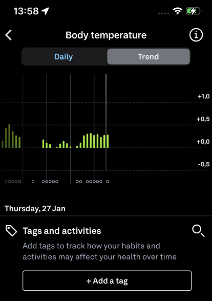 Each date in the Trend view displays a weighted average of how your body temperature varies from your baseline based on a three-day window. Days closer to the current date will have more of an impact on your readings.