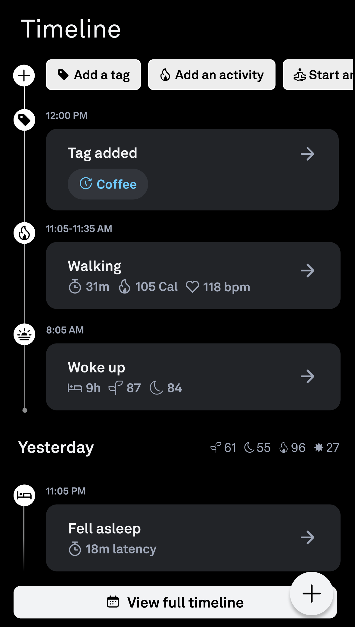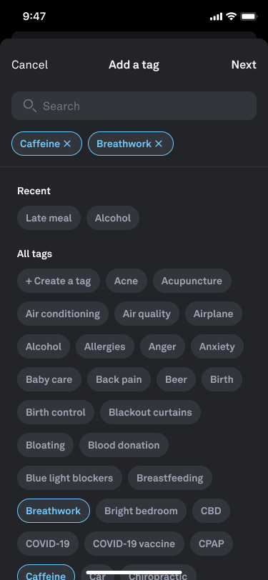 The Oura App offers over 100 searchable tags, including alcohol, caffeine, fasting, headache, late meal, meditation, melatonin, nap, sauna, sick, stress, travel, and more. If we do not have the tag you are looking for, you can create your own custom tag.