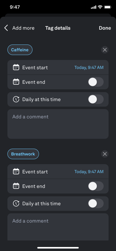 With custom tags, you can add the same information as is available to preset tags, such as date, start and end time, comments, and whether it occurs daily. Once a custom tag is added, it will appear in your tag list. A custom tag can also be edited and deleted at any time. To edit a custom tag, tap on the pencil icon next to the tag, adjust the copy as needed, and tap on Save. You can delete a custom tag in the "Tag details" menu, but that will delete the tag from your list and all your previous entries.
