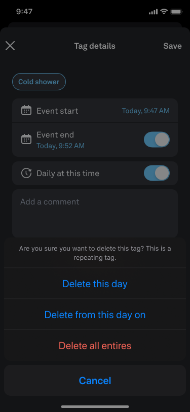 For repeating tags, you can edit the details (start date, end date, or comment) to just that day or from that day on. You can choose to delete a repeating tag for a specific date, from a specific date going forward, or all entries.