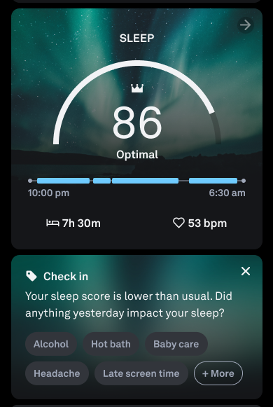 On days when your Sleep Score is higher or lower than usual, Oura will suggest tags during your first morning sync on the home screen. You can choose from the suggested tags, or tap + More to choose from the full list of available tags. Selecting one or more tags and tapping Done will add the tag(s) to that day's summary. Smart tags are available for: