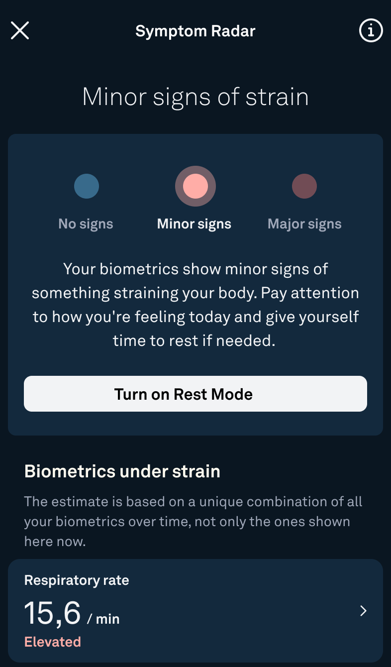 If there are minor or major signs of strain, the Oura App will recommend focusing on rest and recovery and will display the biometrics that are showing the most change. If needed, you can enable Rest Mode, which pauses your Activity Score, goal, and all activity contributors. Symptom Radar will continue to monitor your metrics even with Rest Mode activated.