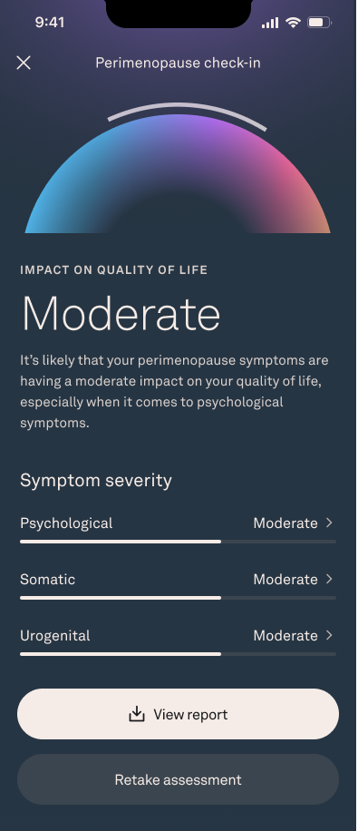 Perimenopause Check-in is a short survey based on the Menopause Rating Scale (MRS), where you can assess the severity of your symptoms on a five-point scale (from “None” to “Very Severe”). The survey takes 2-3 minutes to complete.