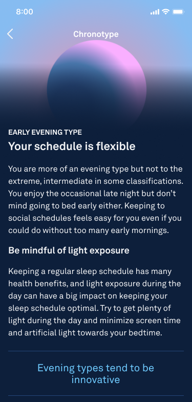 "Chronotype" is another way of saying if you're a morning person, a night person, or somewhere in between. Oura divides chronotypes into six types: