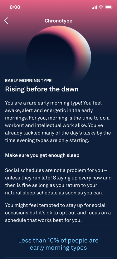 Your Body Clock card will tell you how closely your sleep rhythm's midpoint from the night before was aligned to the midpoint of an optimal sleep window, as determined by your chronotype. If necessary, the Body Clock will provide guidance on how much to adjust your sleep timing in order to align with your circadian rhythm.