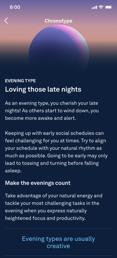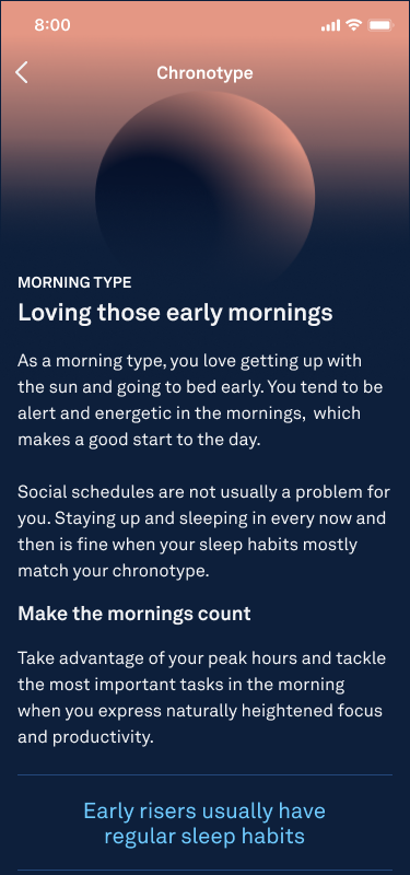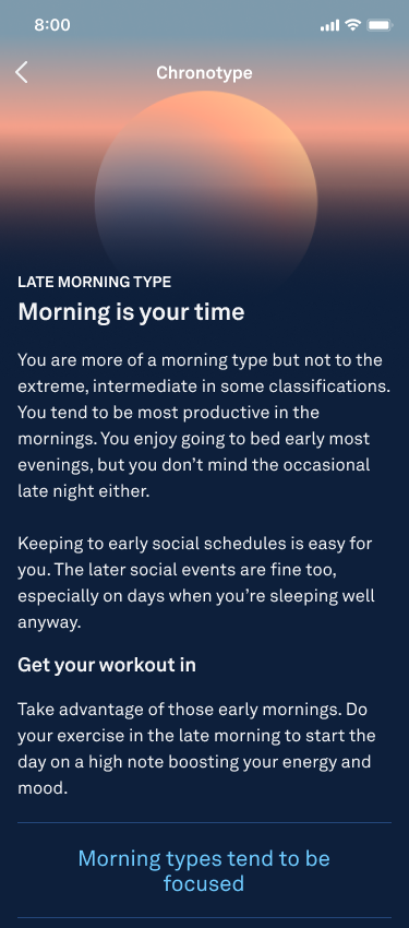 Tap the info ⓘ icon in the upper-right corner of the app for more information on circadian rhythms. Tap the chronotype description at the bottom of the Body Clock screen for more information on your specific chronotype.