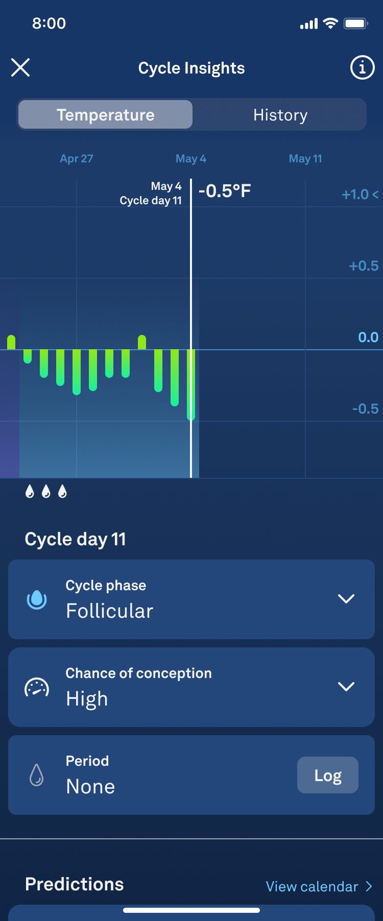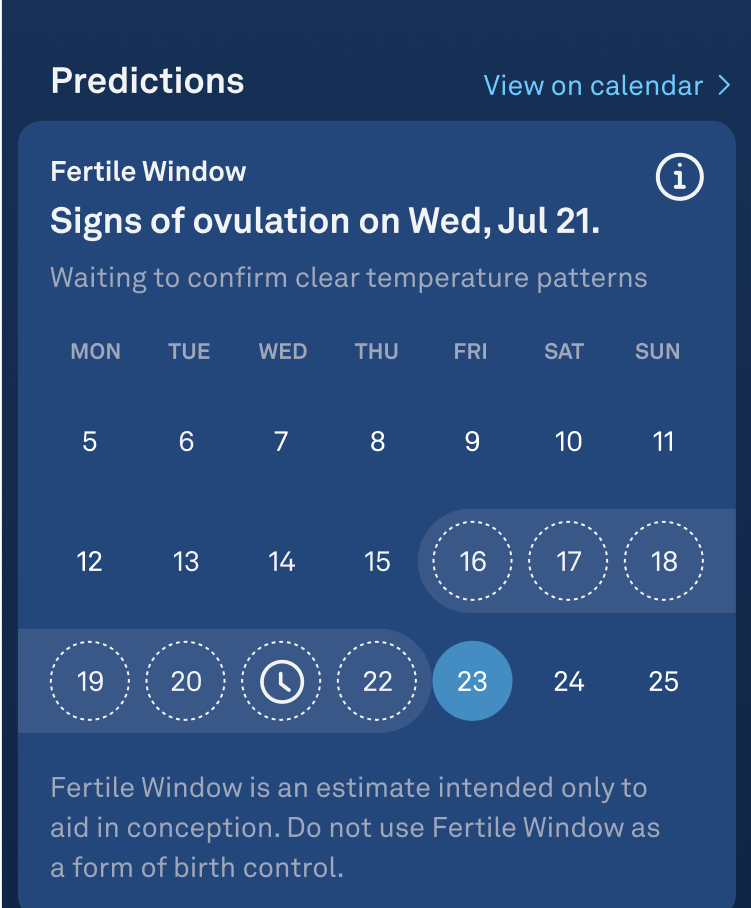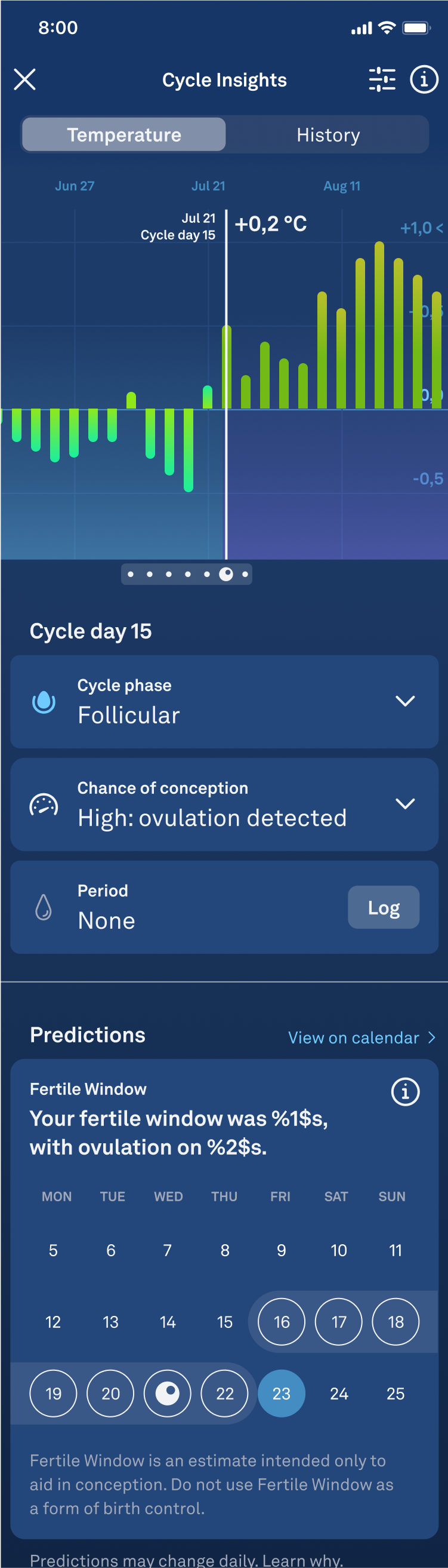 Fertile Window will provide you with more information on your chances of getting pregnant throughout your cycle. When using Cycle Insights, you’ll see an estimate of your peak fertility, chance of conception, predicted ovulation day, and when ovulation has been detected.